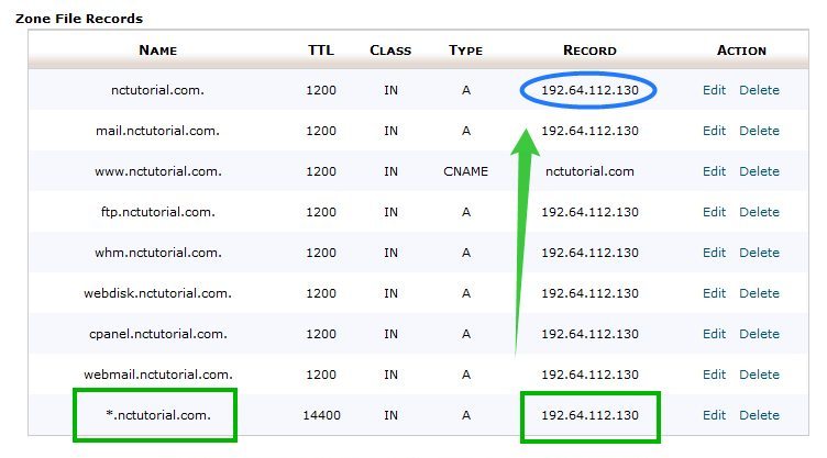- Make sure that there is an A record for *.yourdomain.com created and pointed to the server IP address ( it could coincide with the IP address of your main domain or ftp.yourdomain.com is pointed to).